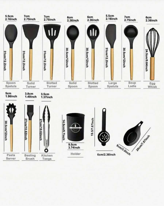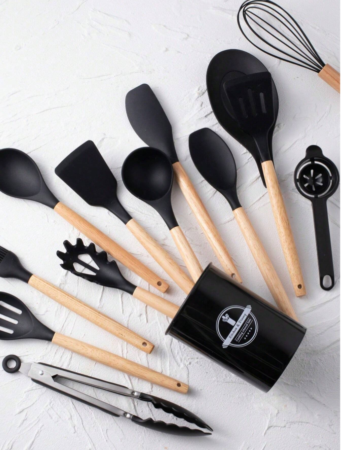 14pcs Silicone Kitchen Utensil Set with Wooden Handles and Storage Bucket is a complete and stylish solution for all your cooking needs. Crafted from premium food-grade silicone, these utensils are heat-resistant, non-stick safe, and gentle on cookware, while the smooth wooden handles provide a comfortable grip and an elegant touch. The set includes essential tools for stirring, flipping, serving, and cooking, all neatly organized in a convenient storage bucket for easy access and space-saving organization. Durable, easy to clean, and designed for everyday use, this versatile utensil set is perfect for home kitchens, apartments, and anyone looking to upgrade their kitchen accessories with both function and style.