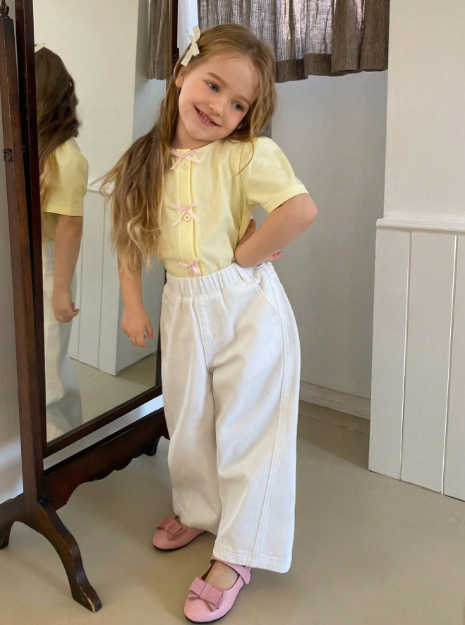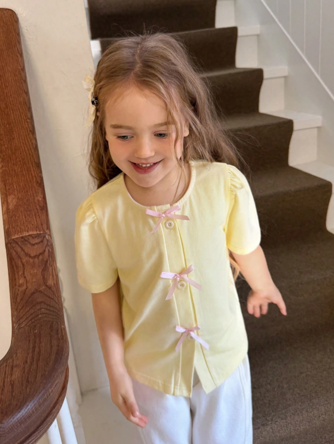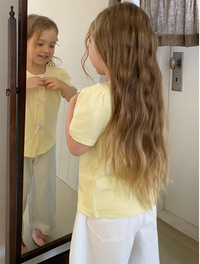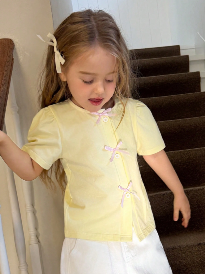 DAZY Young Girl Bow Decor Front Button Round Neck Short Sleeve T-Shirt is a cute and stylish everyday top designed for comfort and effortless fashion. Featuring a classic round neckline with charming bow decorations and a front button detail, this T-shirt adds a playful yet elegant touch to casual outfits. Crafted from soft, breathable fabric with a relaxed fit, it ensures all-day comfort whether worn for school, outings, playdates, or lounging at home. Easy to pair with skirts, jeans, or shorts, this versatile top brings a sweet and trendy look to any young girl’s wardrobe.