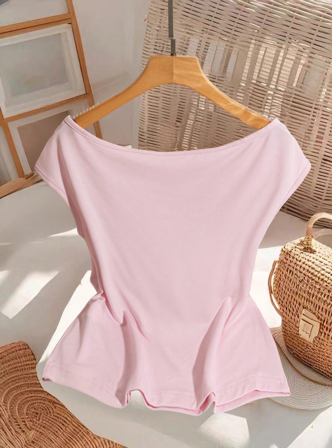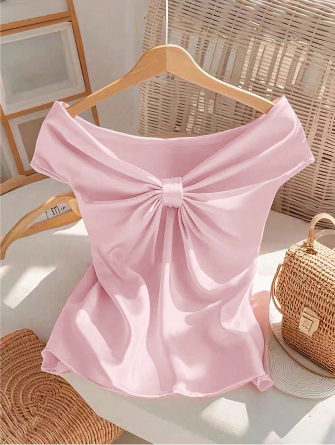 Embrace warm-weather elegance with this GlowEve off-shoulder t-shirt, featuring a playful tie-knot detail that adds a flirty touch to its solid color design. The soft, breathable fabric keeps you cool while the shoulder-baring silhouette offers a chic, sun-ready look. Versatile enough to pair with jeans, skirts, or shorts, this top transitions effortlessly from beach days to evening outings. This essential summer piece combines comfort with sophisticated, shoulder-grazing style.