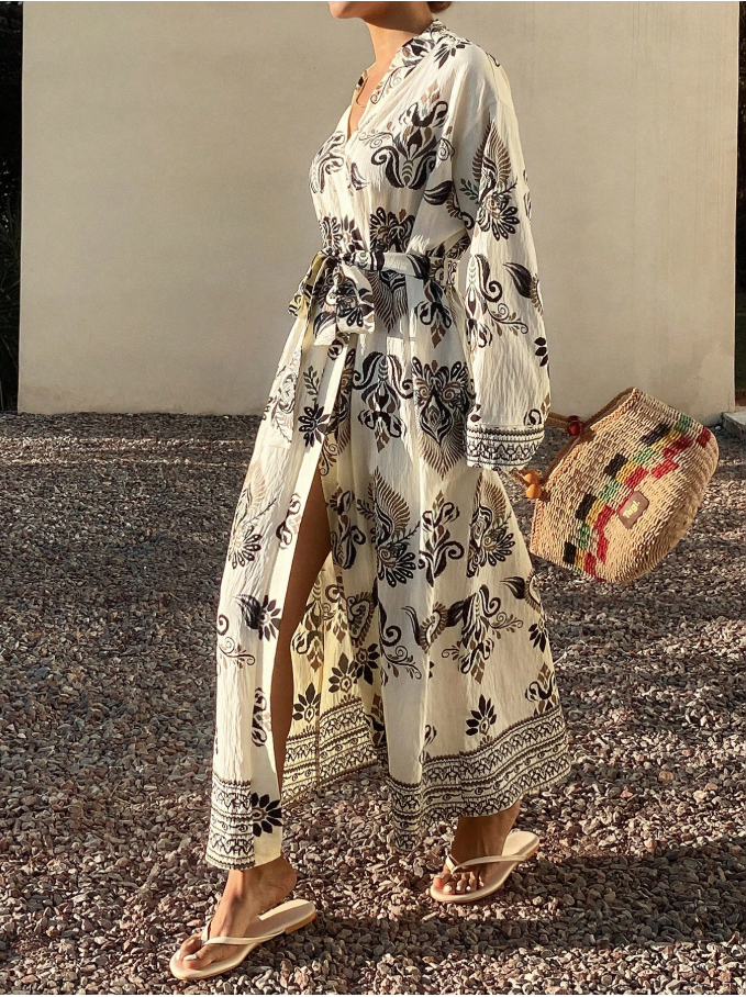 Livesso Women’s Loose Tie-Front All-Over Print Vacation Kimono Shirt