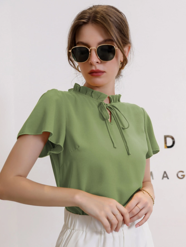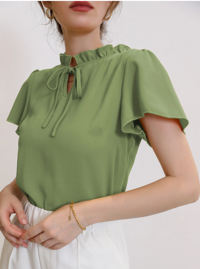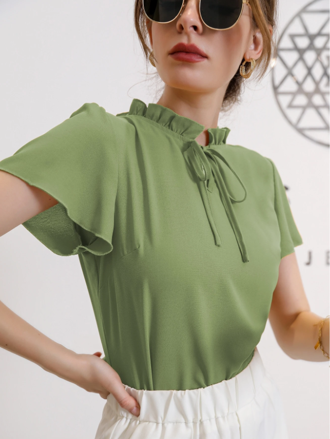 Crafted from high-quality polyester fabric with a slight stretch, this blouse offers a comfortable regular fit that skims the body gracefully. The elegant frill detailing and plain, minimalist design create a versatile top that pairs effortlessly with everything from tailored trousers for a polished office look to your favorite jeans for a chic casual ensemble. Whether you’re heading to a brunch date, a special event, or simply want to add a statement piece to your daily rotation, this blouse delivers effortless style and undeniable charm.