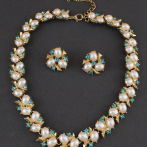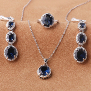 3pcs Gold Jewelry Set: Faux Pearl & Blue Crystal Necklace, Earrings, Bridal/Party/Daily Wear Accessories