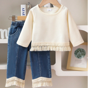 €26.99This 2PCS/Set Young Girl Outfit includes a stylish solid color fringe long sleeve top paired with matching fringe denim pants for a trendy and eye-catching look. Designed for comfort and easy movement, it’s perfect for daily wear, school, outings, and casual occasions. A fashionable matching set that gives young girls a cute modern style while...