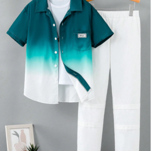 €25.99This is a modern and stylish outfit designed for growing boys who love a trendy yet comfortable look. This fashionable set features a unique gradient short-sleeve shirt paired with matching long pants, creating a cool coordinated style that stands out effortlessly. Made from soft, breathable, and skin-friendly fabric, it ensures all-day comfort and easy movement...