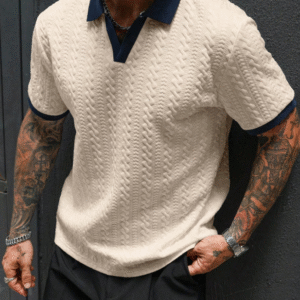 Manfinity Homme Men’s Contrast Color Short Sleeve Casual Commuter Polo Shirt Men Knitted Polo Shirt Cream Polo Shirt Men Mens V Neck Knitted Shirt Mens Short Sleeve Sweater Polo Mens Textured Polo Shirt Old Money