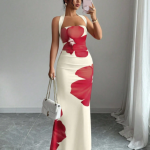 Elenzga Women’s 2025 Summer Halter Tie Waist Slim Fit Printed Mid-Length Dress