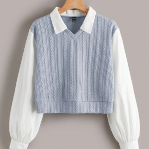 SHEIN EZwear Needle Woven Patchwork Contrast Collar Cable Knit 2 In 1 Blouse