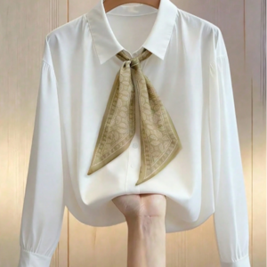 SHEIN Franclia Elegant White Woven Shirt Collar Blouse With Wrist Length Sleeves And Scarf Detail