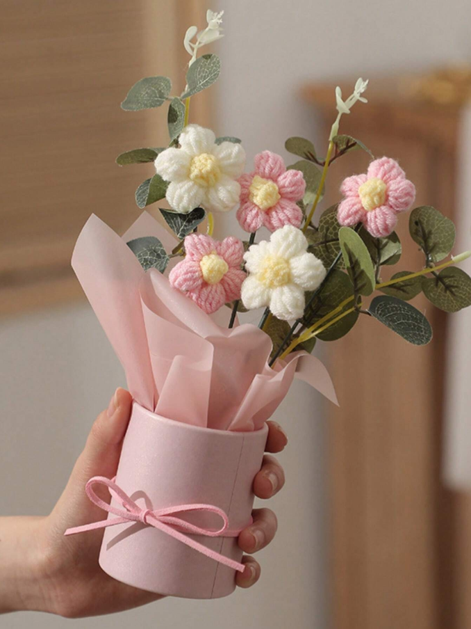 Brighten any space with this charming handmade knitted yarn flower bouquet, featuring soft fabric and knitted blooms crafted with love and attention to detail. Each artificial flower is carefully designed to mimic the beauty of real blossoms, offering lasting color and texture without the need for watering or maintenance. The set includes a rustic paper bucket, making it ready to display as a cozy, whimsical centerpiece. Perfect as a heartfelt gift or cheerful home decor, this bouquet brings warmth and creativity to any room.