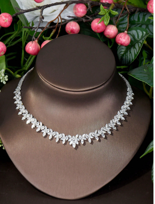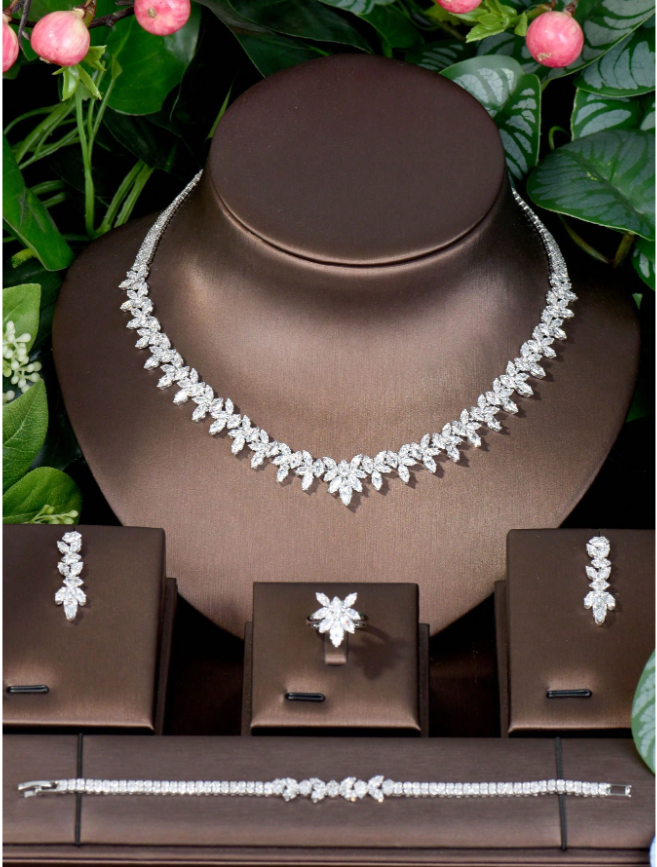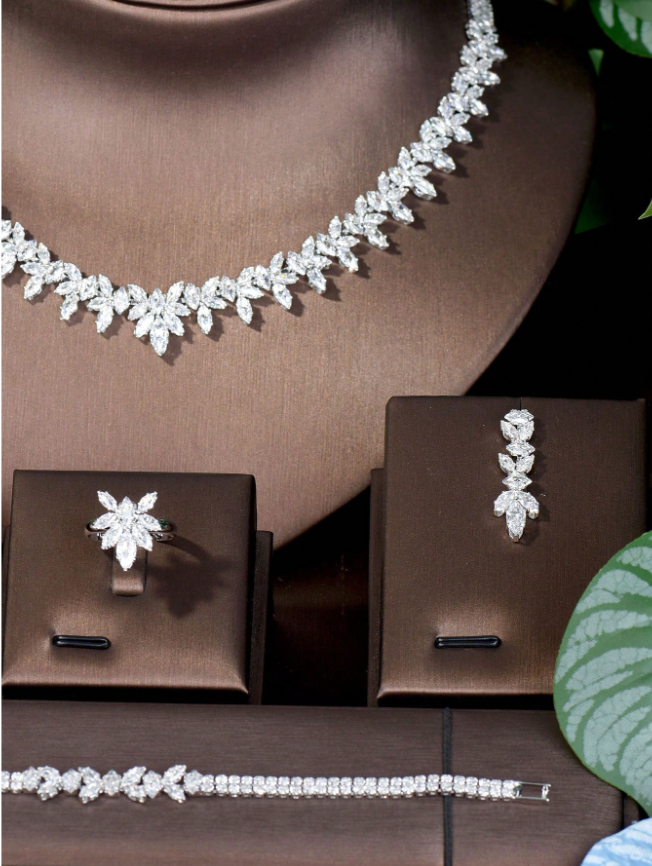Celebrate her achievements with delicate, nature-inspired elegance. This Romantic Cubic Zirconia Leaf Jewelry Set features beautifully crafted leaf motifs adorned with sparkling cubic zirconia stones, capturing the light with every movement. The set includes a matching necklace and earrings, designed to create a cohesive and refined look.
