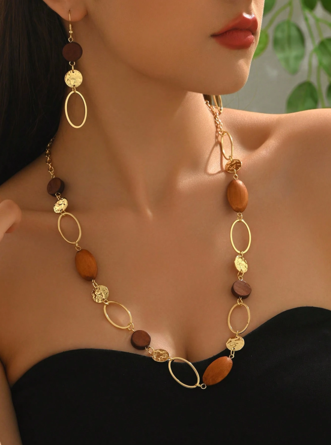 Elevate your autumn layering with this vintage-inspired wooden bead jewelry set, featuring a hollow round design that adds natural texture to any outfit. The coordinating necklace and earrings showcase warm, organic tones that complement chunky sweaters, casual blouses, or bohemian dresses beautifully. Lightweight and comfortable, the sweater chain necklace drapes elegantly while the matching earrings frame the face with rustic charm. This versatile two-piece suit is the perfect accessory set for women who love earthy, artisan-crafted elegance.