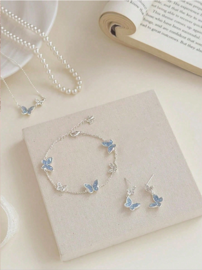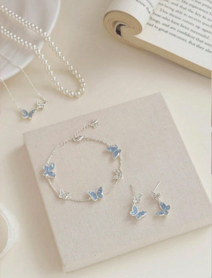 This exquisite jewelry set features stunning asymmetrical blue crystal butterflies adorned with lustrous faux pearls, creating a elegant and whimsical design that catches the light beautifully. The complete ensemble includes a matching necklace, bracelet, earrings, and ring, offering a coordinated look perfect for both casual wear and special occasions. Available in sets of 1, 2, or 5 pieces, this enchanting collection makes a thoughtful and memorable holiday gift for your girlfriend or best friend.