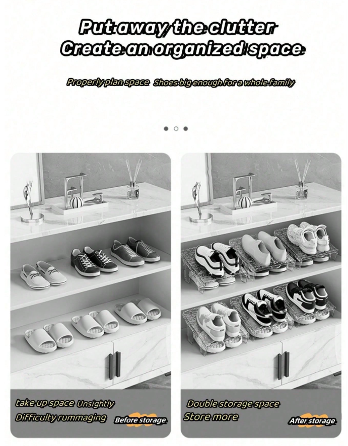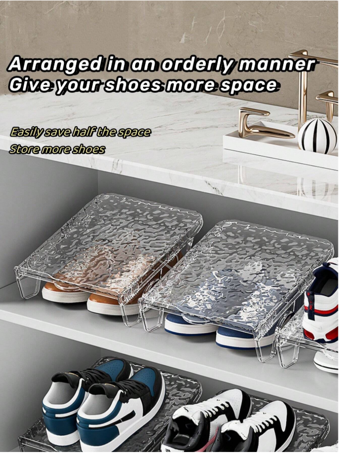 **1pc Double Layer Shoe Rack** is a **space-saving organizer** featuring a stylish **PET wavy pattern design** for a modern, airy look. Its double-layer structure efficiently stores multiple pairs of shoes while minimizing floor space usage. The durable, transparent material allows for easy visibility and quick selection of your favorite footwear. Ideal for entryways, closets, or bedrooms, it offers a chic and practical solution for a tidy, clutter-free home.