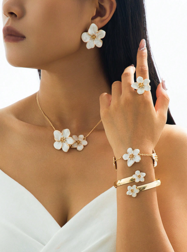 Embrace delicate, handcrafted beauty with the Handmade 5-Petal Flower Jewelry Set. This complete collection features a charming five-petal flower motif meticulously crafted in a pristine white finish, appearing across a coordinating necklace with pendant, earrings, ring, bracelet, and bangle.