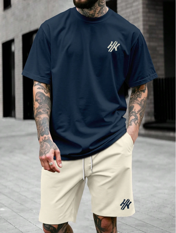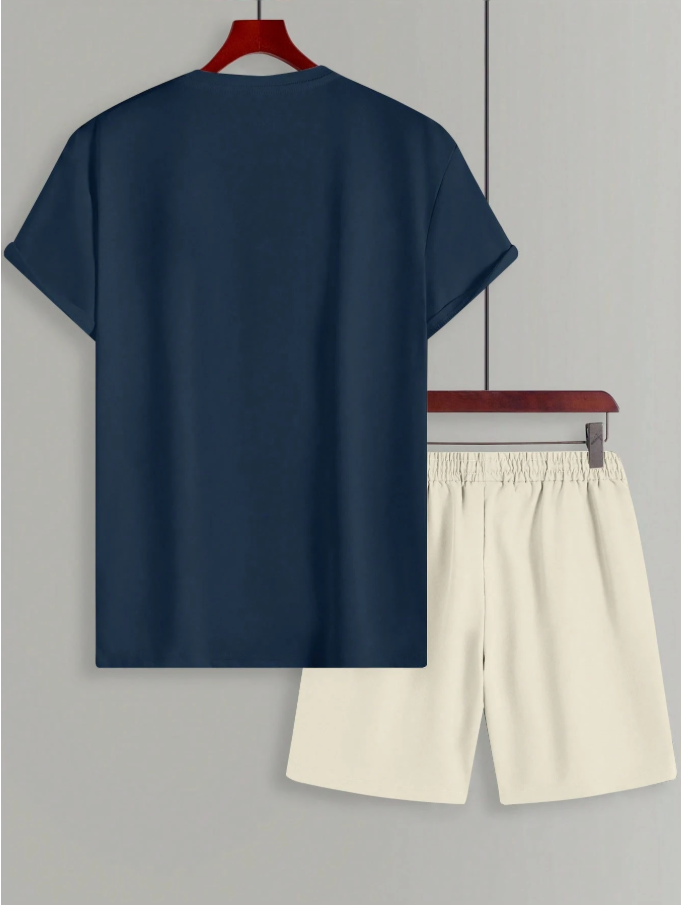 2pcs Men Letter Print Round Neck Short Sleeve T-Shirt & Drawstring Waist Pocket Shorts Set is a casual and comfortable summer outfit designed for everyday wear. This coordinated set includes a relaxed-fit short sleeve T-shirt with trendy letter print and a pair of matching shorts featuring a drawstring waist and convenient pockets. Made from lightweight, breathable fabric, the set keeps you cool and comfortable in warm weather, making it perfect for casual hangouts, beach days, strolls, or weekend activities. Its simple yet stylish design makes it easy to mix and match with other pieces in your wardrobe for versatile summer styling.