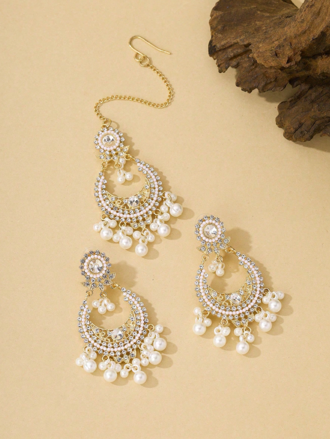 3pcs Luxury Faux Pearl Pendant Earrings + Headchain Jewelry Set, Suitable For Women’s Daily Wear And Girls’ Party Wear