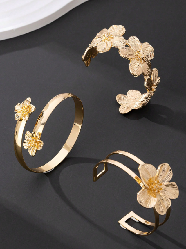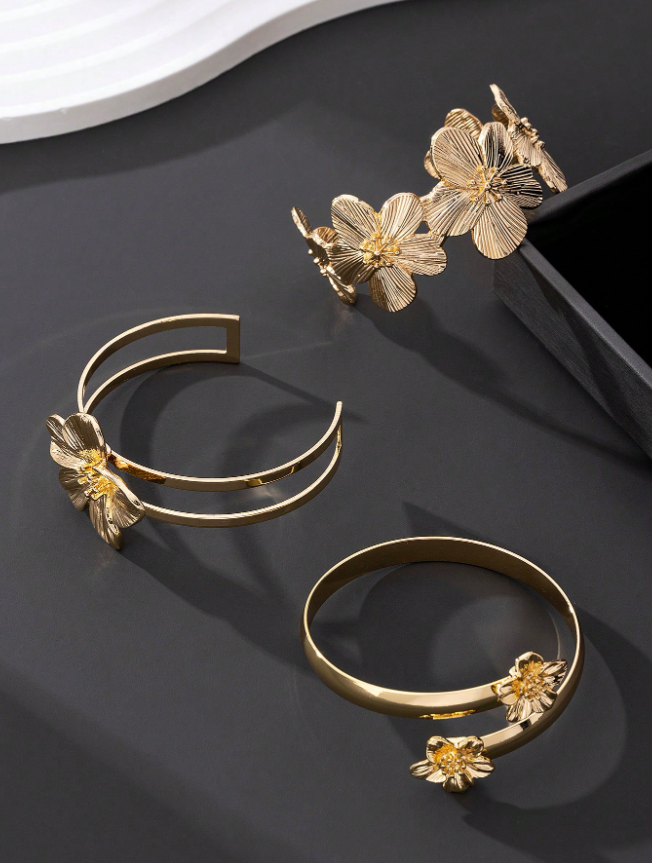 Adorn her wrist with a garden of eternal elegance. This 3-Piece Gold Flower Bangle Bracelet Set features delicate, three-dimensional flower motifs crafted in a lustrous gold-tone metal. Each bangle is uniquely designed yet harmoniously matched, creating a layered, luxurious look when worn together.