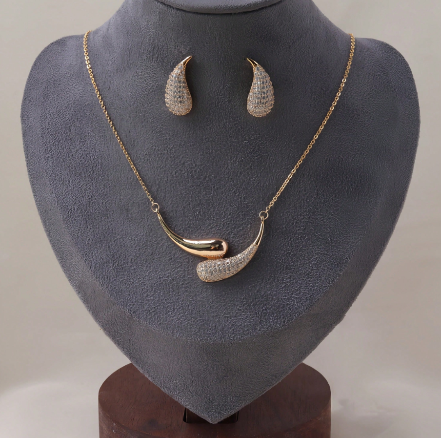 This exquisitely crafted fashion jewelry set features a matching pair of elegant earrings and a coordinating necklace, designed to add refined sophistication to both daily outfits and party ensembles. The delicate details and high-quality finish ensure a luxurious look that transitions seamlessly from office wear to evening celebrations, offering versatile styling options for the modern woman. Whether paired with casual attire for a touch of everyday elegance or worn to complement formal dresses for special occasions, this beautiful set makes a thoughtful gift and a timeless addition to any jewelry collection.