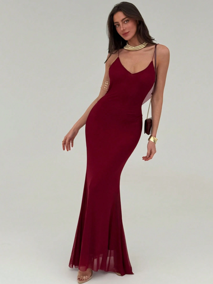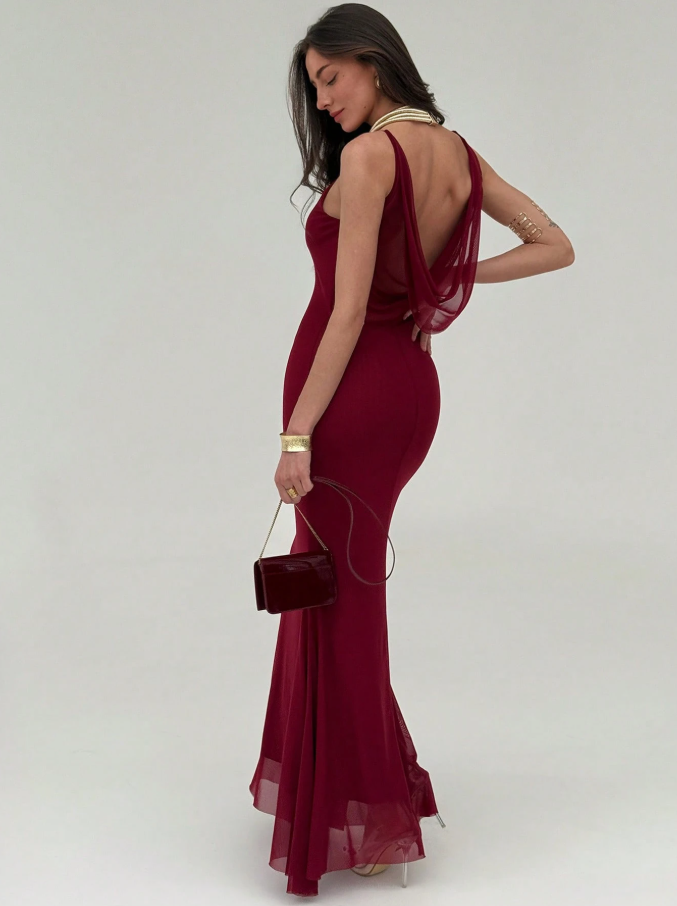 Designed for the most enchanting evenings, this Burgundy Bodycon Dress is the epitome of sophisticated seduction. Crafted from a luxurious, high-stretch mesh fabric, it hugs your curves in all the right places, creating a stunning silhouette that transitions from a fitted bodice to a dramatic mermaid hem.