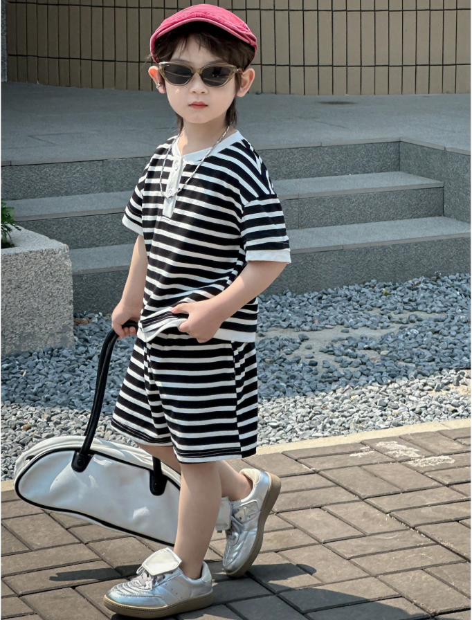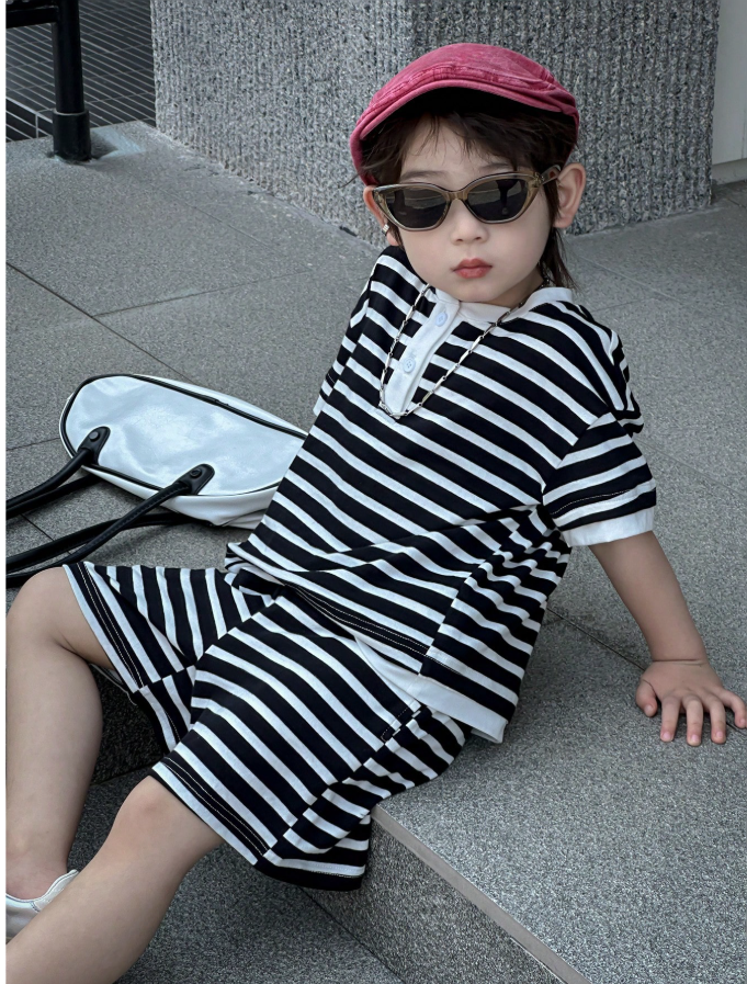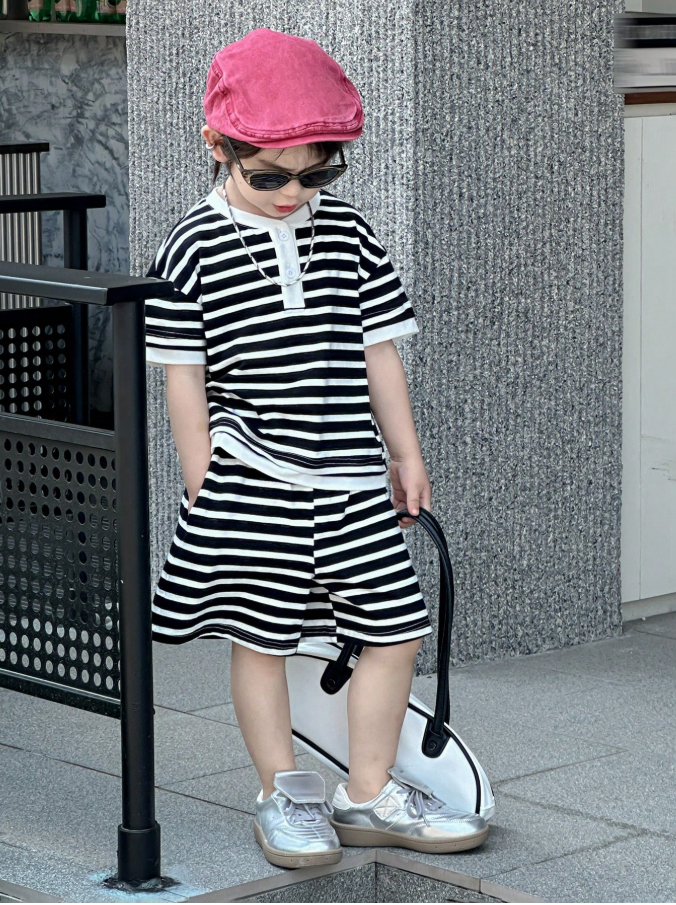 The DAZY 2PCS/Set Boy (Small) Summer Outfit includes a stylish stripe print crew neck knitted T-shirt and matching knitted stripe shorts for a cute and comfortable look. Made for breathable all-day wear, this set is perfect for summer outings, playtime, vacations, and casual daily wear. A trendy matching outfit that keeps your little one looking smart and feeling cool.