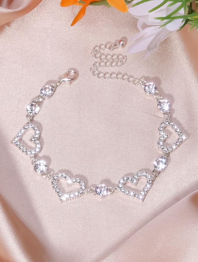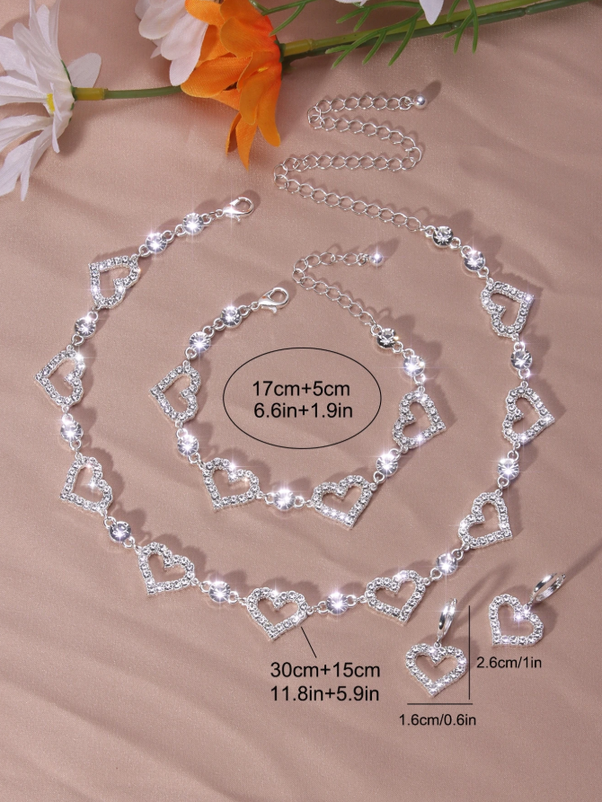 This stunning three-piece jewelry set features a romantic hollow heart bead design covered in full shiny rhinestones for maximum sparkle. The adjustable choker necklace, dangle earrings, and chain bracelet create a coordinated look perfect for Valentine’s Day gifting or any special occasion.