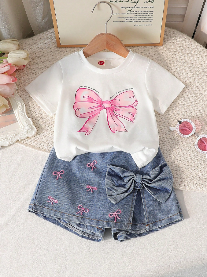 Girls Cute Bow Print Round Neck Top + Fashion Bow Embroidered Skirt Pants 2pcs Set