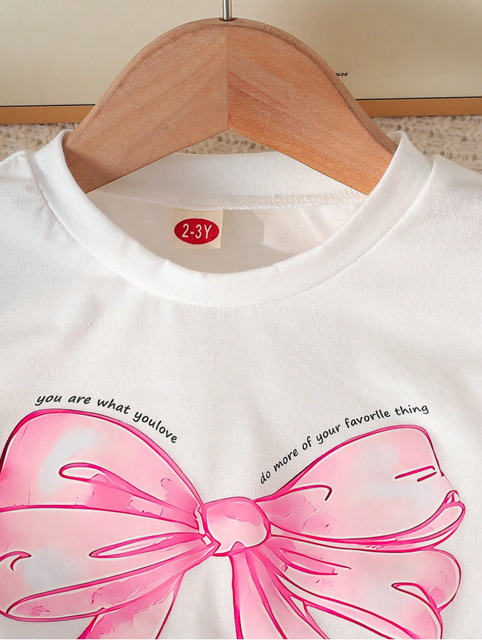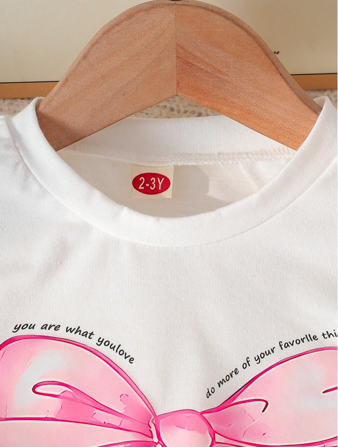 This is a charming and stylish outfit designed to make your little one look adorable while staying comfortable. The round neck top features a cute bow print that adds a sweet and playful touch, while the soft fabric ensures a cozy feel for everyday wear, special outings, or casual gatherings. This set brings together comfort and cuteness in a perfect balance.