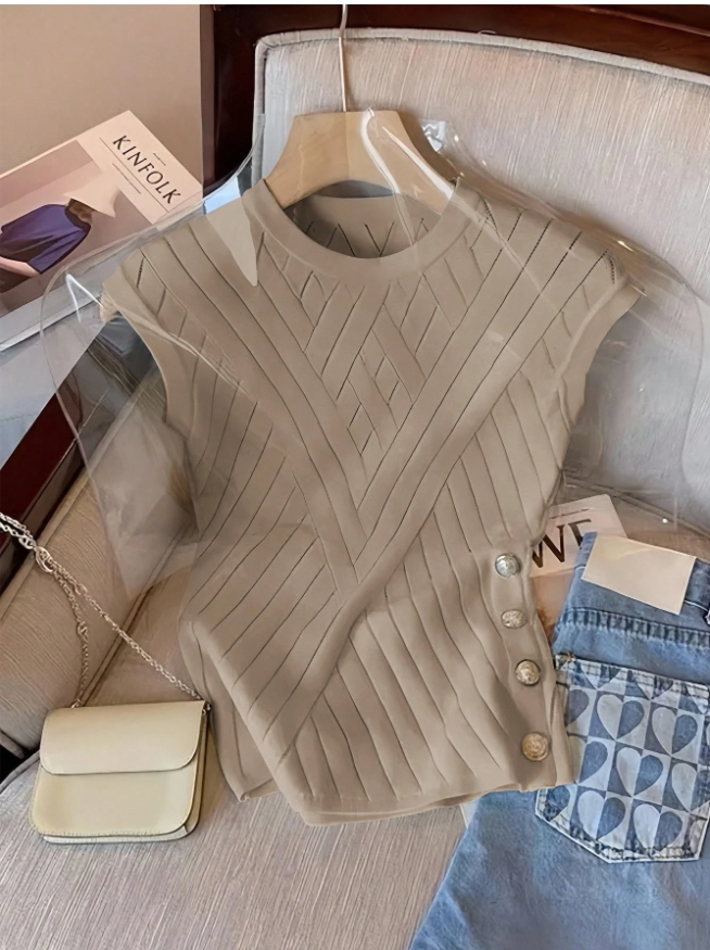 GlowEve Solid Color Round Neck Button Decor Elegant Fashionable Knit Top