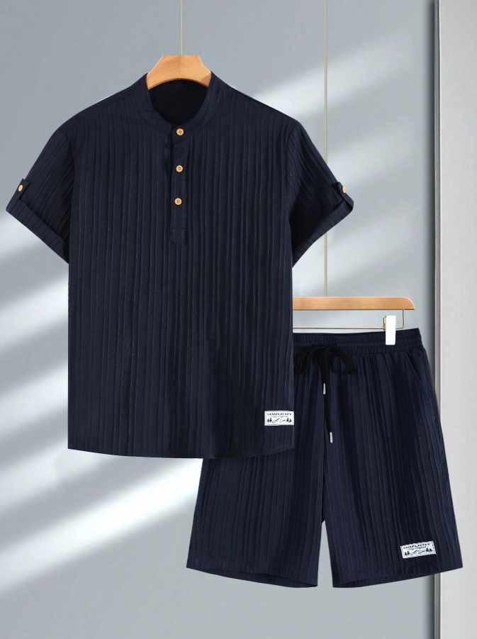 Elevate your holiday style with this men’s 2-piece spring/summer set, featuring a classic 3-button Henley neck short sleeve shirt and matching drawstring shorts. The solid color jacquard fabric adds subtle texture and visual interest, elevating the casual silhouette for a polished yet relaxed look. Perfect for vacations, weekend outings, or lounging, this coordinated set offers effortless style without the hassle of mixing and matching. Step into warm-weather comfort with this essential, textured ensemble.