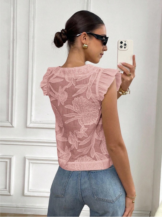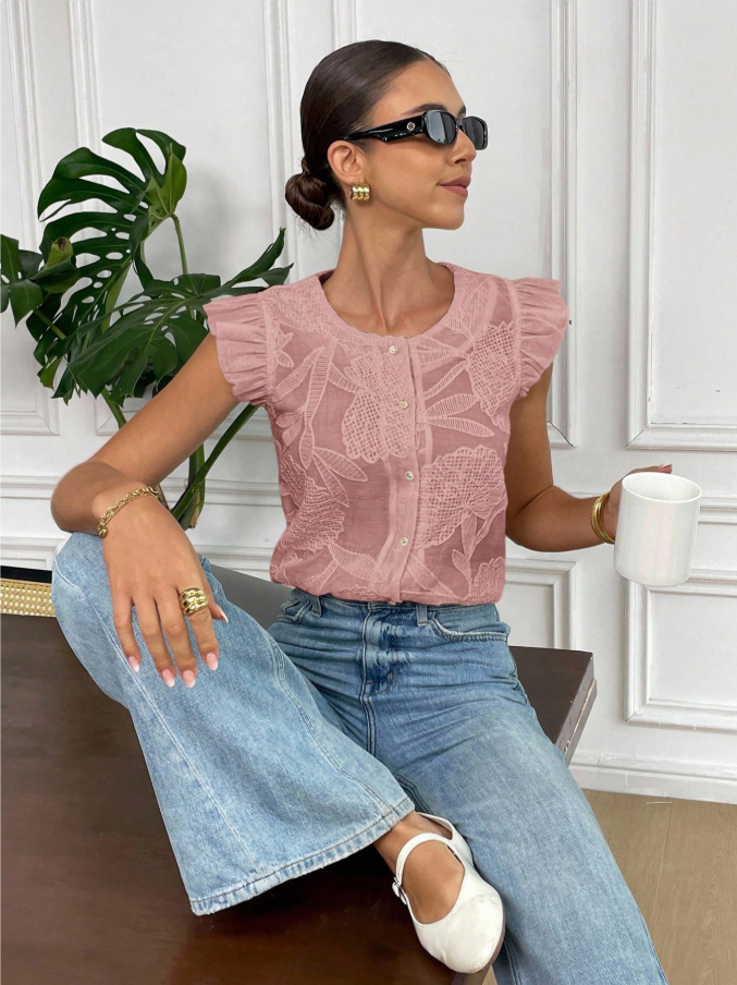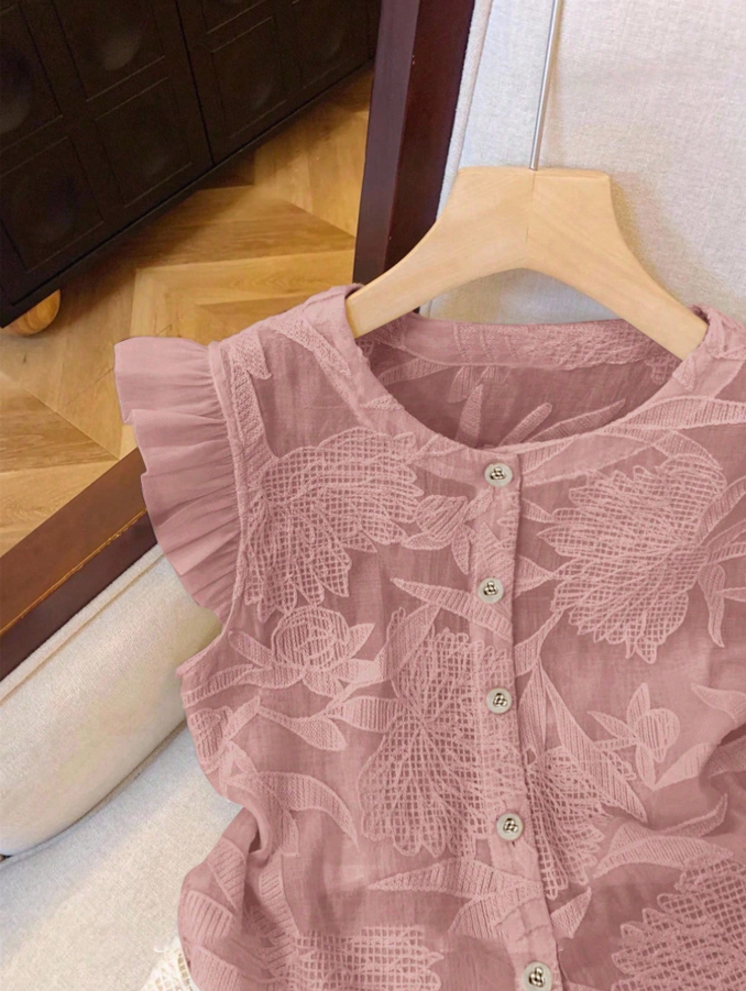 Elevate your summer style with this Serisse floral jacquard blouse, featuring delicate textured blooms and a charming cap sleeve silhouette. The soft pink hue and single-breasted detail add a touch of feminine elegance, while the breathable fabric keeps you cool on warm days. Its versatile round neck design pairs effortlessly with jeans, skirts, or trousers for any casual occasion. This essential top combines artisanal texture with effortless, romantic charm.