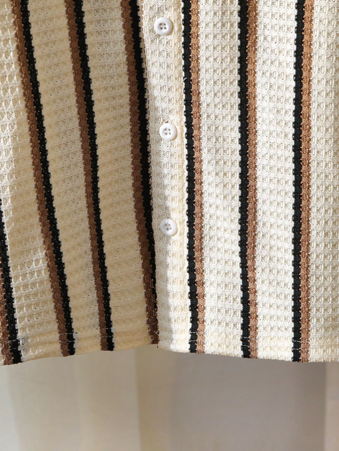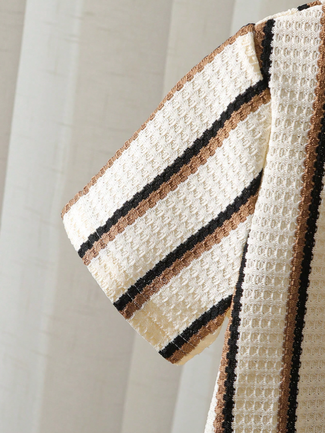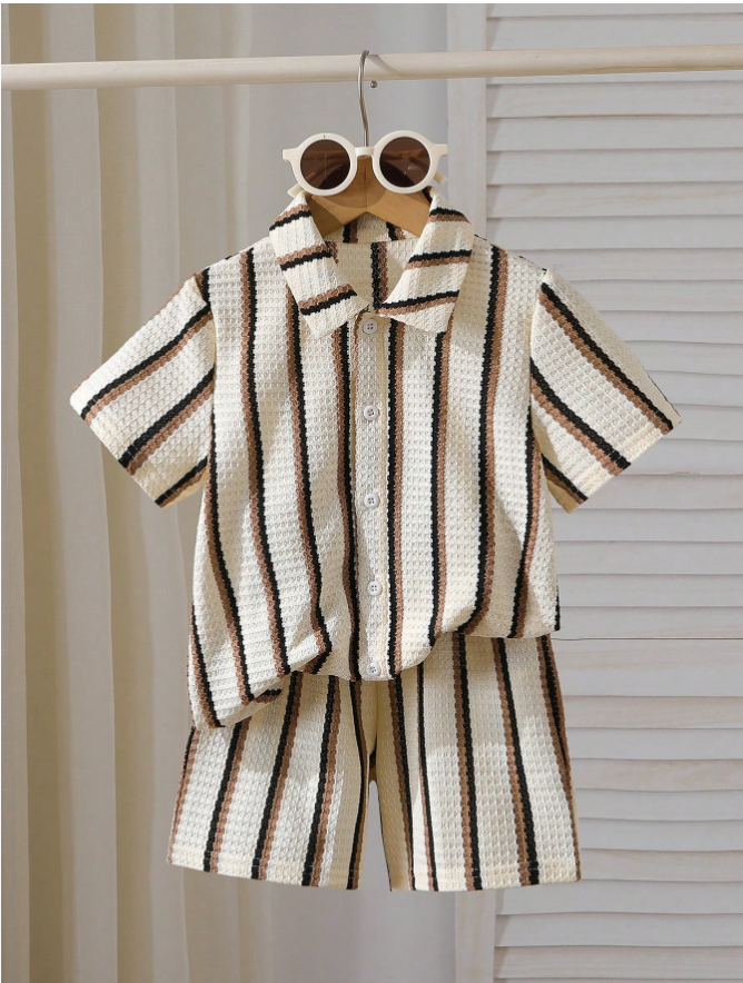 SHEIN Genkimix Kids 2pcs/Set Young Boy Textured Stripe Knit Shirt and Shorts Set is a stylish and comfortable outfit designed for everyday summer wear. Featuring a textured stripe knit short-sleeve shirt paired with matching lightweight shorts, this set delivers a modern and coordinated casual look. Crafted from soft, breathable fabric with a relaxed fit, it ensures all-day comfort and easy movement for active boys. Perfect for school, outdoor play, vacations, family outings, and casual daily wear, this versatile two-piece set blends practical comfort with trendy style for young boys.