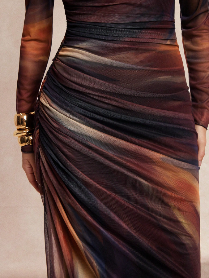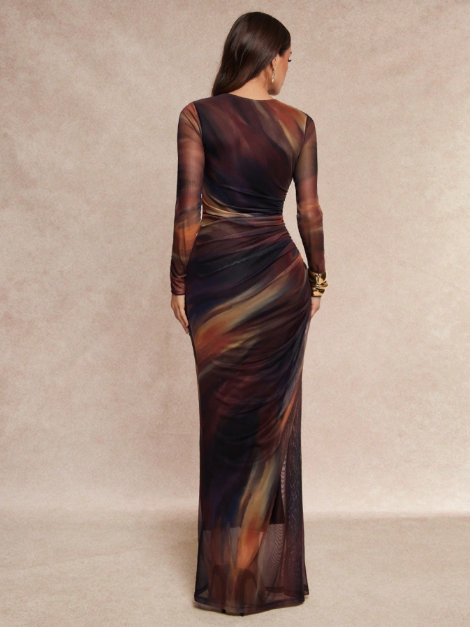 Silquee This Women’s Brown Tie-Dye Printed Mesh Round Neck Long-Sleeved Dress Features A Fitted Waist With Ruching