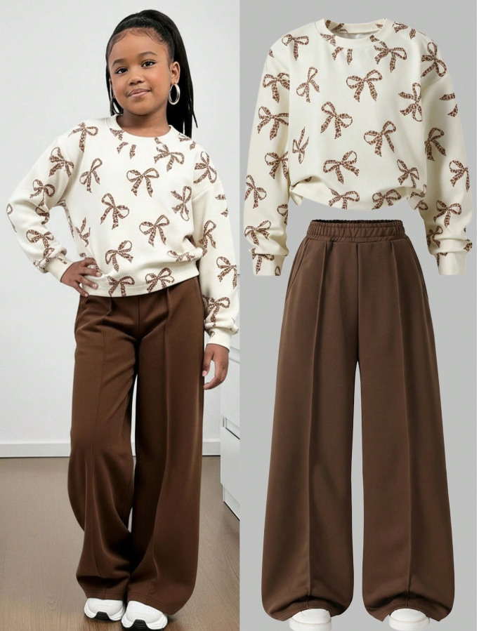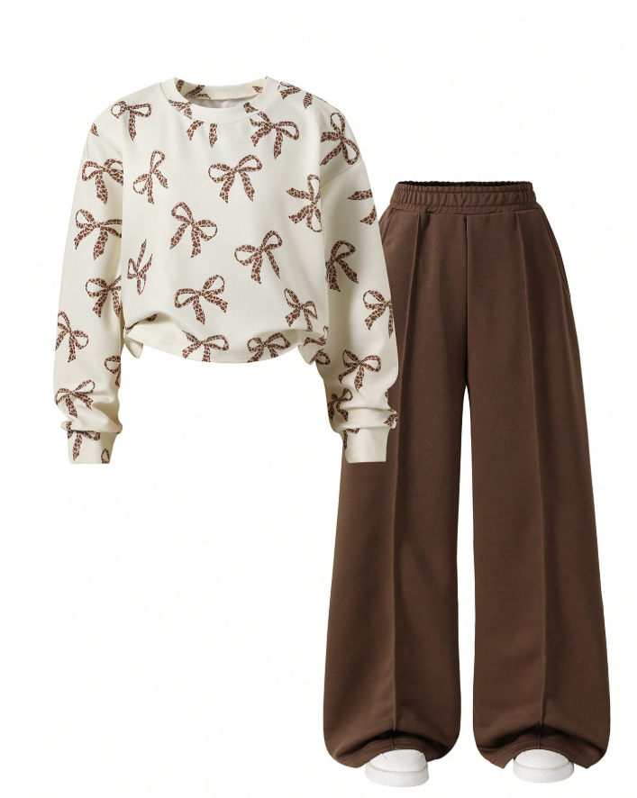 Sparklyn Tween Girls Casual Basic Versatile Daily School Sports Street Washed Snow Floral Print Crew Neck Cropped Loose Sweatshirt + Wide Leg Pants Set