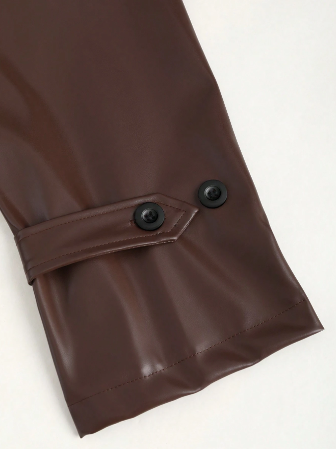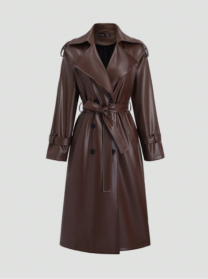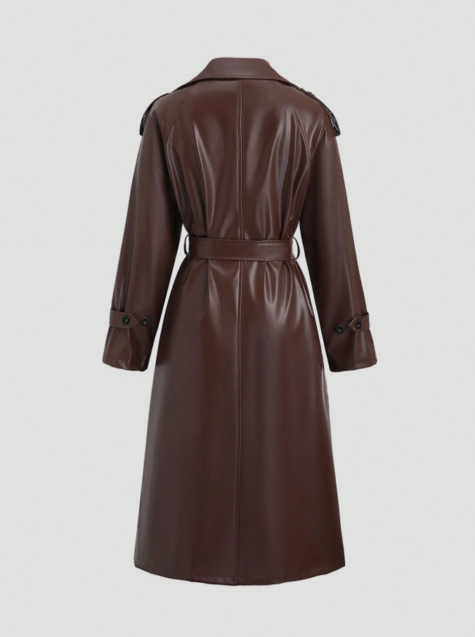 Step into the season with an air of refined elegance and street-style chic in this Brown PU Leather Trench Coat from Sweetra. Expertly designed to merge classic tailoring with contemporary edge, this coat features a sharp lapel collar and a striking double-breasted placket, secured with a sleek self-belt that defines your waist for a effortlessly polished silhouette.