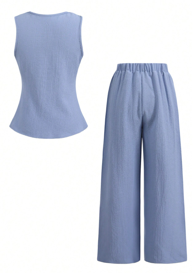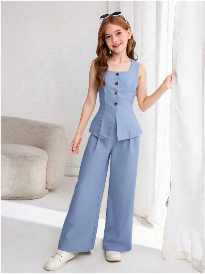 SHEIN Tween Girl Casual Elegant Commute Jacquard Striped Vest & Pants Set is a stylish and modern two-piece outfit designed to blend street fashion with polished casual elegance. The set features a sleeveless jacquard-striped vest top with a button-front design, offering a refined yet trendy look, paired with classic straight-leg pants that create a sleek and flattering silhouette. Crafted from comfortable, breathable fabric, it ensures all-day ease of wear while maintaining a structured, put-together appearance. Perfect for school, casual outings, commuting, family gatherings, and weekend wear, this versatile set allows tween girls to look effortlessly chic while staying comfortable and confident.