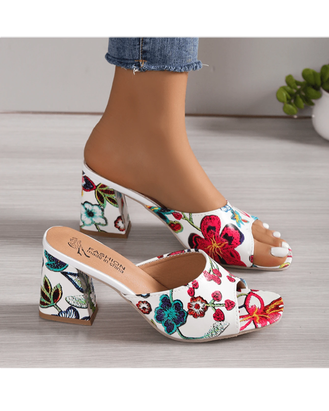 Step into summer with these European and American style chunky heeled sandals, featuring a sexy strap peep-toe design and trendy platform sole for added height and comfort. The random printed floral patterns create a unique, artistic look that ensures no two pairs are exactly alike, making every step a statement. The sturdy chunky heel provides stability and support for all-day wear, whether you’re strolling through city streets or dancing at beach parties. These playful slides combine bold, unpredictable prints with effortless warm-weather style.