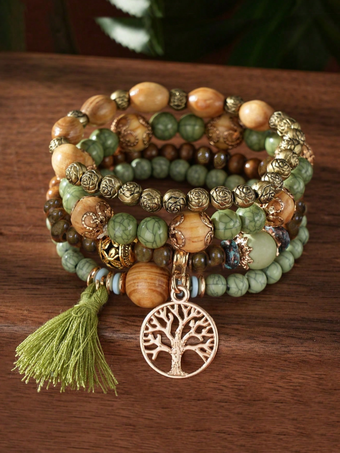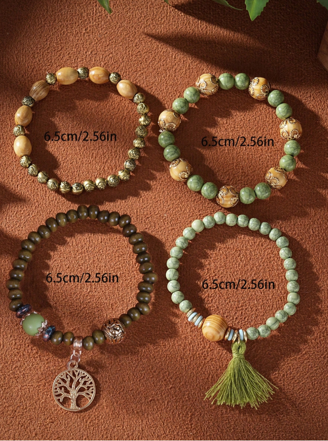 Embrace free-spirited elegance with this 4-piece bohemian-style jewelry set, featuring Tree of Life pendant necklaces and matching multi-layer wooden bead bracelets. The intricate Tree of Life symbol adds spiritual depth, while the natural wooden beads bring organic texture and warmth to each piece. Designed for effortless layering, this set allows you to mix and match for a personalized, boho-chic look perfect for festivals, vacations, or daily wear.