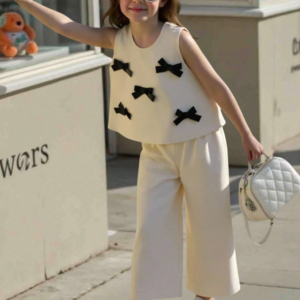 SHEIN Elladie Kids 2 Parça/Set, Küçük Kız Çocuklar İçin Şık ve Sevimli 3D Fiyonklu Kolsuz Askılı Bluz ve Kısa Paçalı Pantolon Takımı, Günlük Kullanım, Tatil ve Geziler İçin Çok Yönlü, İlkbahar/Yaz