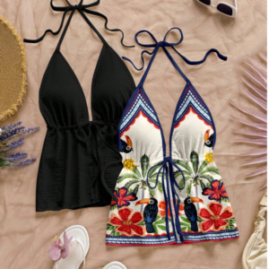 €17.99Embrace summer vibes with the Soleia 2PCS Women’s Tropical Rainforest Halter Cami Top Set, featuring a playful mix of retro palm tree and bird prints paired with a classic solid black design. The V-neck halter style and backless woven construction create a breezy, flattering fit perfect for warm weather.