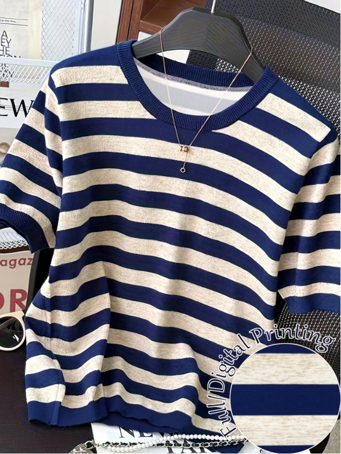 Brighten your summer wardrobe with this Resyla casual colorblock striped t-shirt, featuring a classic round neck and playful striped pattern that adds a pop of modern charm. The breathable, lightweight fabric keeps you cool and comfortable during warm days, while the relaxed fit offers effortless style for any casual outing. Versatile enough to pair with denim, shorts, or skirts, this tee transitions seamlessly from beach days to city strolls.