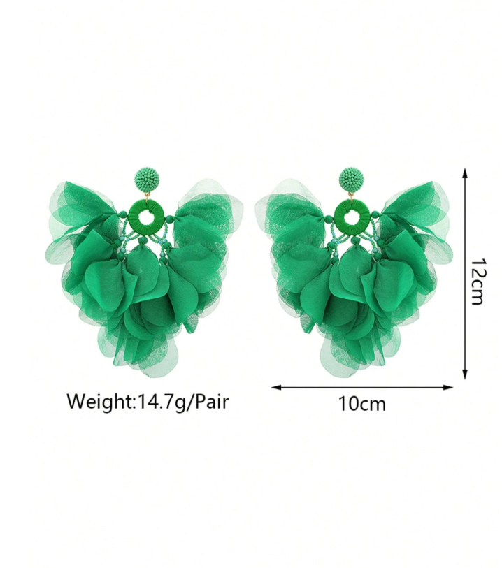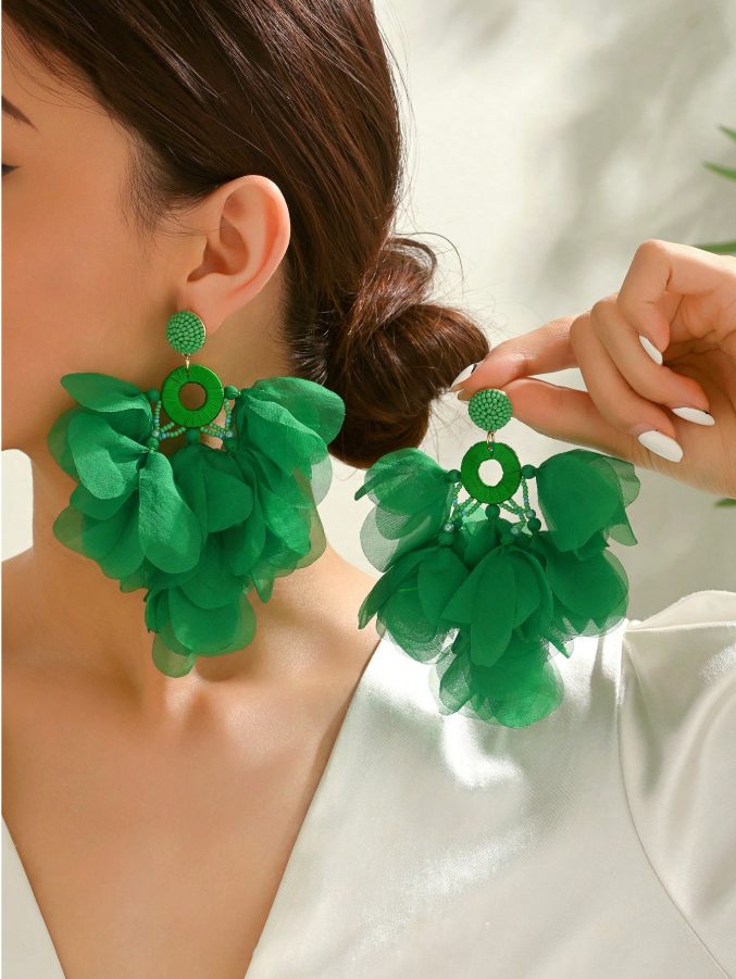 1 Pair Handmade Bohemian Style Green Fabric Petal Tassel Earrings, Suitable For Women To Wear To Parties, Galas, Beach Vacations And Other Occasions