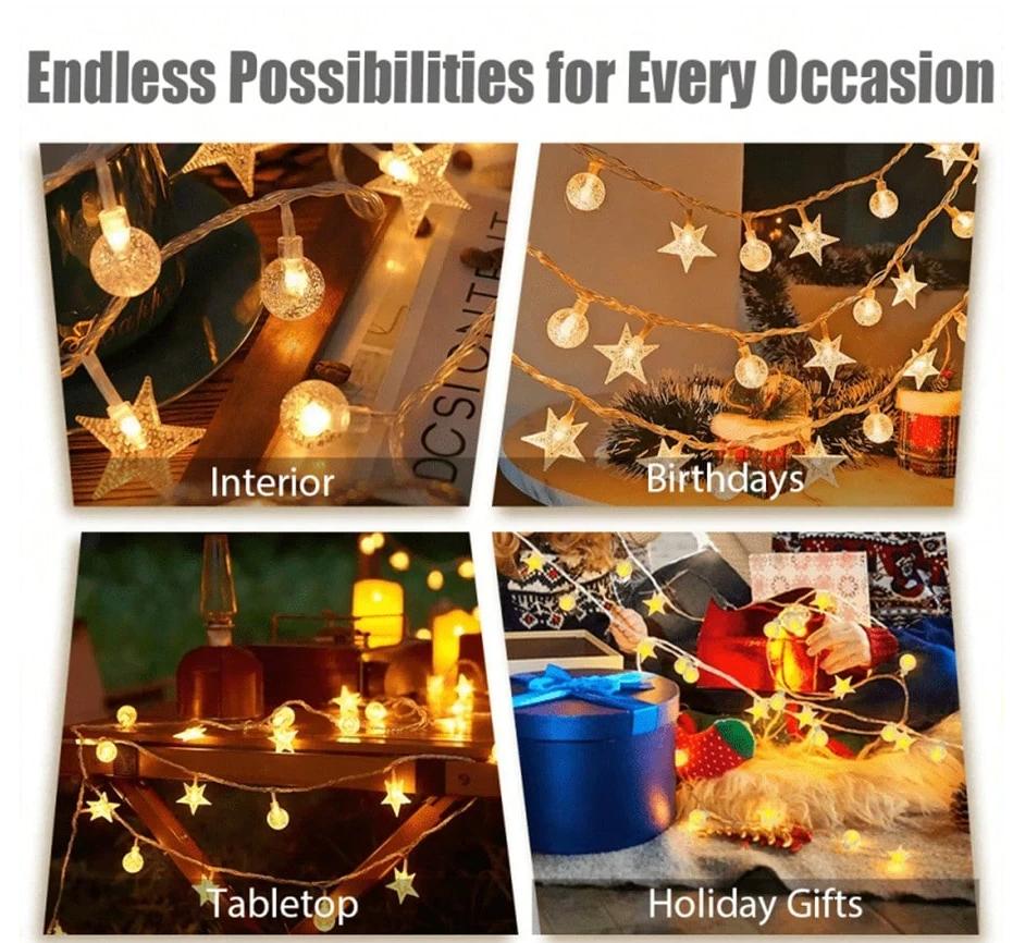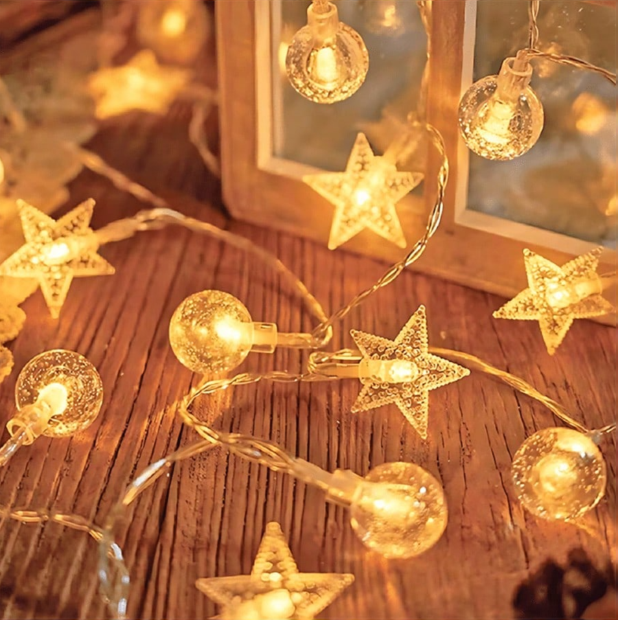 Add a touch of celestial magic to any space with this 1-piece star and bubble ball string light set, featuring charming star-shaped bulbs and glowing bubble accents. Battery-operated for cord-free convenience, these indoor fairy lights are perfect for draping across party walls, bedroom headboards, or wedding backdrops. The warm, twinkling illumination creates a dreamy ambiance that transforms ordinary moments into enchanting memories. Easy to hang and versatile in use, these lights are the perfect decor accent for celebrations or cozy everyday spaces.