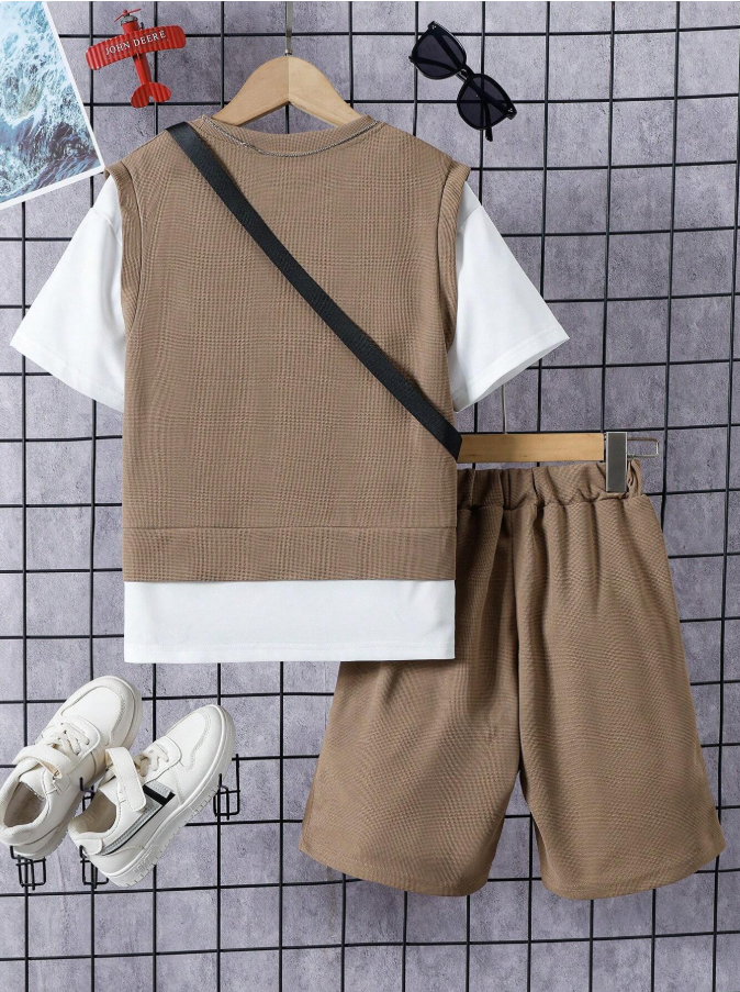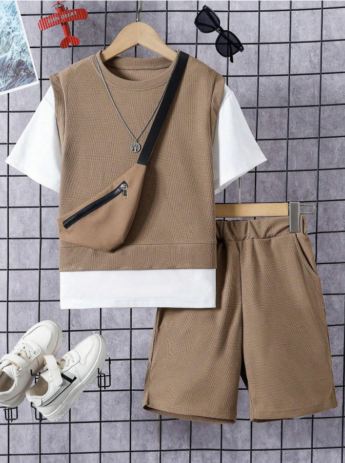 Bu, ilkbahar ve yaz mevsiminde aktif erkek çocuklar için tasarlanmış şık ve kullanışlı bir kıyafet setidir. Bu trend set, benzersiz bir 2'si 1 arada patchwork tişörtü, rahat uyumlu şortla birleştirerek tek parçada havalı bir katmanlı görünüm yaratıyor. Dahil edilen omuz çantası, hareket halindeyken küçük eşyaları taşımak için hem şıklık hem de işlevsellik katarak kıyafeti tamamlıyor.
