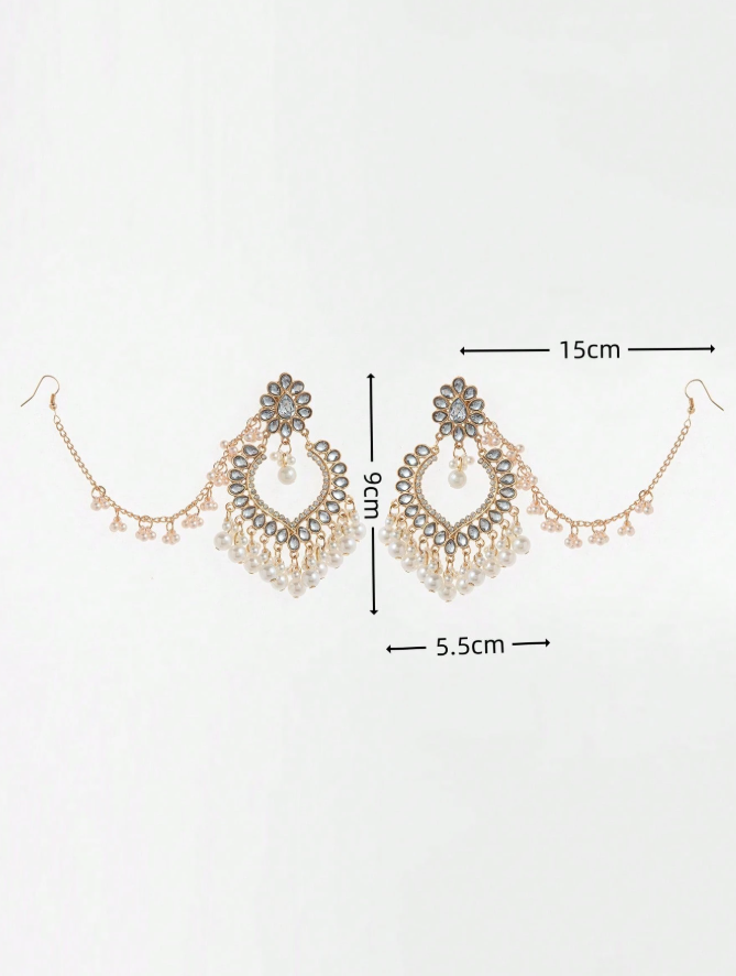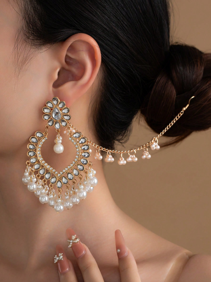 2pcs/Set Vintage Rhinestone Heart Pearl Bell Earrings & Hair Accessories, For Women Wedding Wear