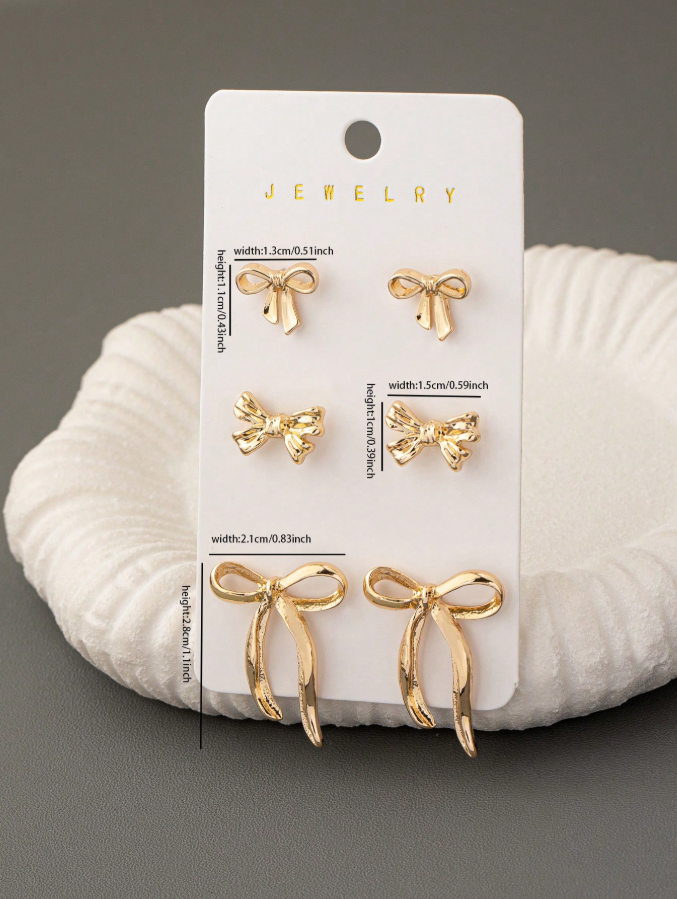 Elevate your accessory collection with this 3-pair gold bow stud earrings set, featuring charming bow motifs in versatile designs for endless styling options. Each pair showcases a polished gold finish that catches the light beautifully, adding a touch of feminine elegance to both casual and formal looks. The lightweight, secure studs ensure all-day comfort, making them perfect for daily wear, work, or special occasions.