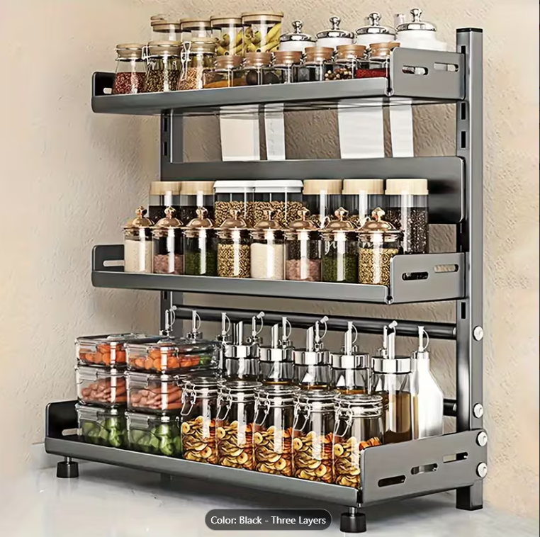 3 Katlı Ağır Hizmet Tipi Metal Mutfak Saklama Rafı ile mutfak düzeninizi baştan yaratın. Yer tasarrufu sağlayan dikey yapısıyla tasarlanan bu sağlam düzenleyici, uzun baharat kavanozlarından ve yağ şişelerinden mutfak gereçlerine, bıçaklara ve baharat paketlerine kadar her şeyi sığdıracak şekilde özelleştirilebilen üç ayarlanabilir rafa sahiptir.