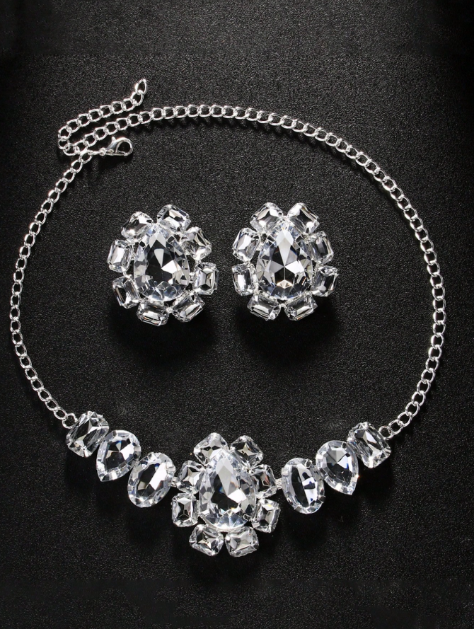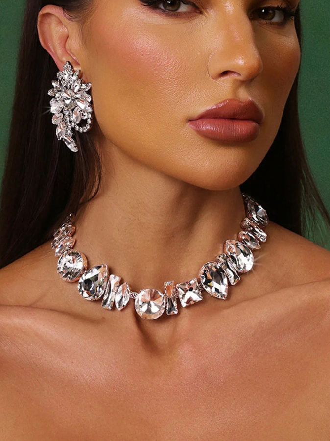 This stunning 3-piece jewelry set includes a sparkling rhinestone necklace and matching earrings, designed to make a bold and glamorous statement. The exaggerated rhinestone placement catches the light from every angle, ensuring maximum shine and attention at any party or special occasion. Perfect for women who love standout accessories, this set adds instant drama and elegance to any outfit.