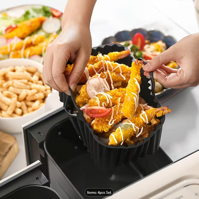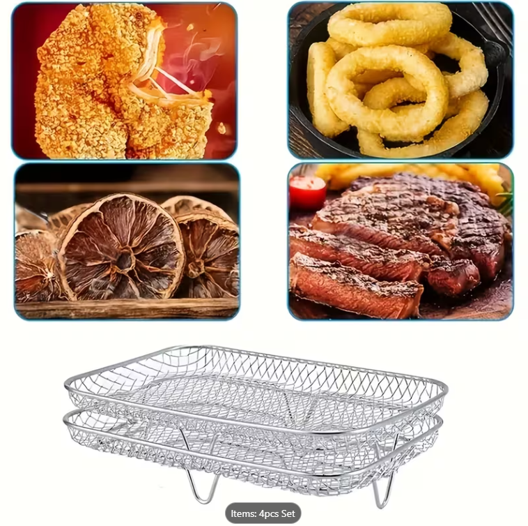 4 parçalı Paslanmaz Çelik Hava Fritözü Rafı ve Silikon Astar Seti ile hava fritözünde pişirme deneyiminizi bir üst seviyeye taşıyın. Bu çok yönlü set, istiflenebilir, gıda sınıfı 304 paslanmaz çelik raflar ve esnek, yeniden kullanılabilir silikon astarlar içerir; bu sayede hava fritözünüzün kapasitesini en üst düzeye çıkararak soğan halkaları, patates kızartması ve sebzeler gibi birden fazla katmanlı yiyeceği aynı anda pişirebilir ve daha hızlı, daha eşit sonuçlar elde edebilirsiniz.