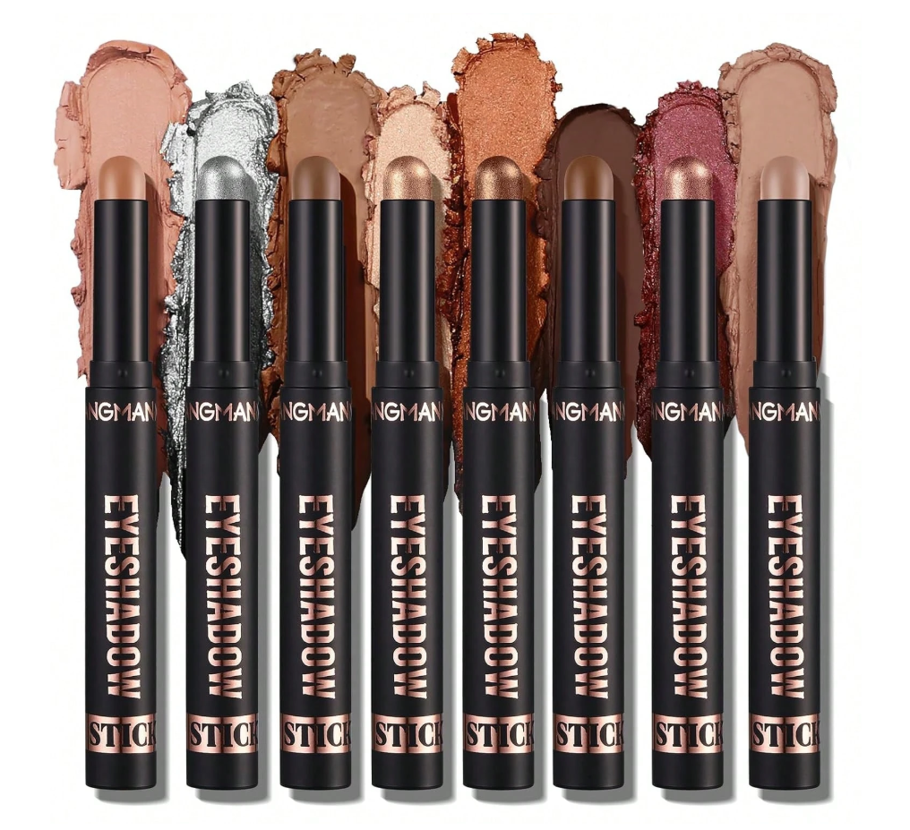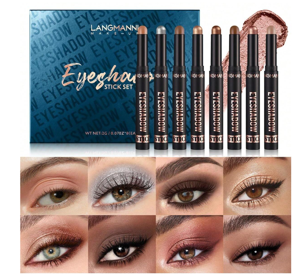 **Beauty Glazed 8PCS Eyeshadow Stick Set** features **shimmer and neutral brown metallic cream** formulas for effortless, one-stroke color. These **highly blendable, crease-resistant pencils** glide on for a bold metallic sheen or a soft matte wash. The long-wearing, creamy texture is perfect for quick, **smudge-proof looks** on the go. An ideal set for creating everything from subtle daytime definition to dramatic, sparkling eye art.