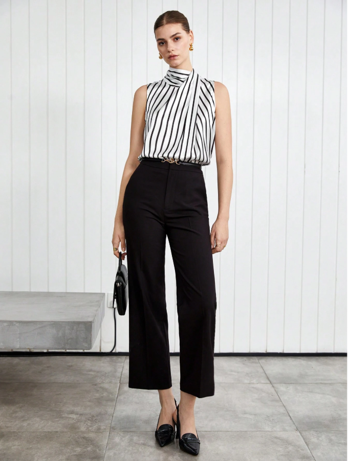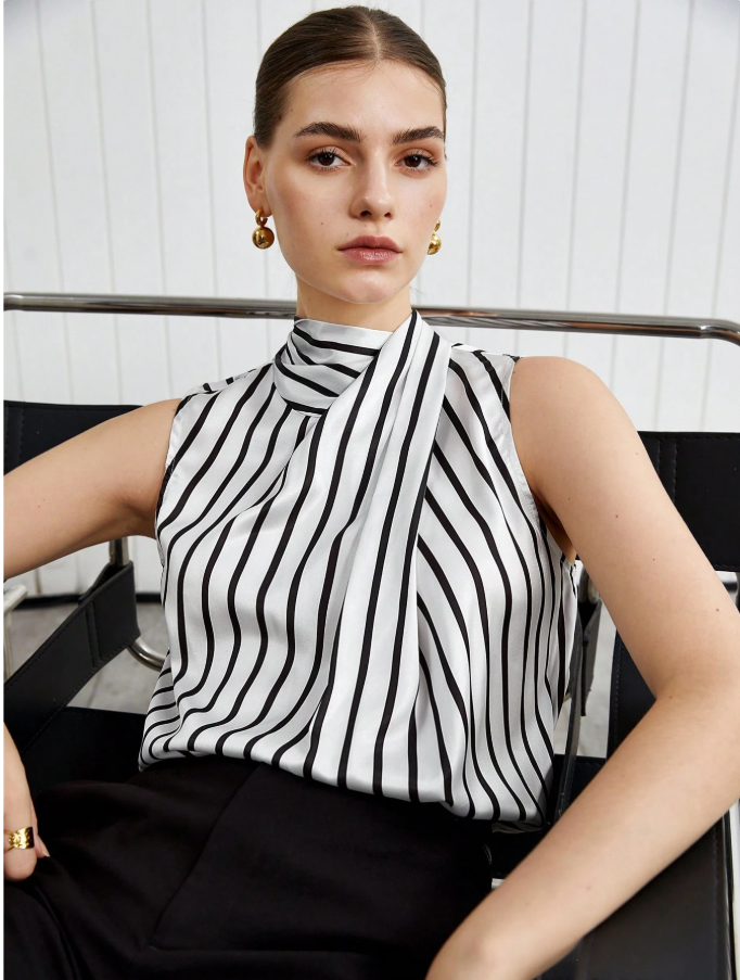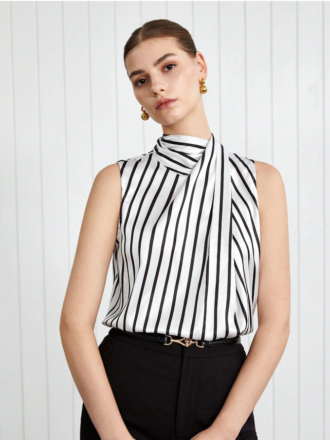 This camisole’s description is a frantic, contradictory mess—trying to be “elegant commuter,” “office casual,” and “party” wear, which guarantees it excels at none. The “satin print” will be a shiny, cheap polyester that feels tacky and looks garish, while the black-and-white stripes will be poorly aligned and blurry. It’s a desperate fast-fashion piece with no coherent identity, offering neither professional polish nor genuine party style, just a poorly made, confusing top.